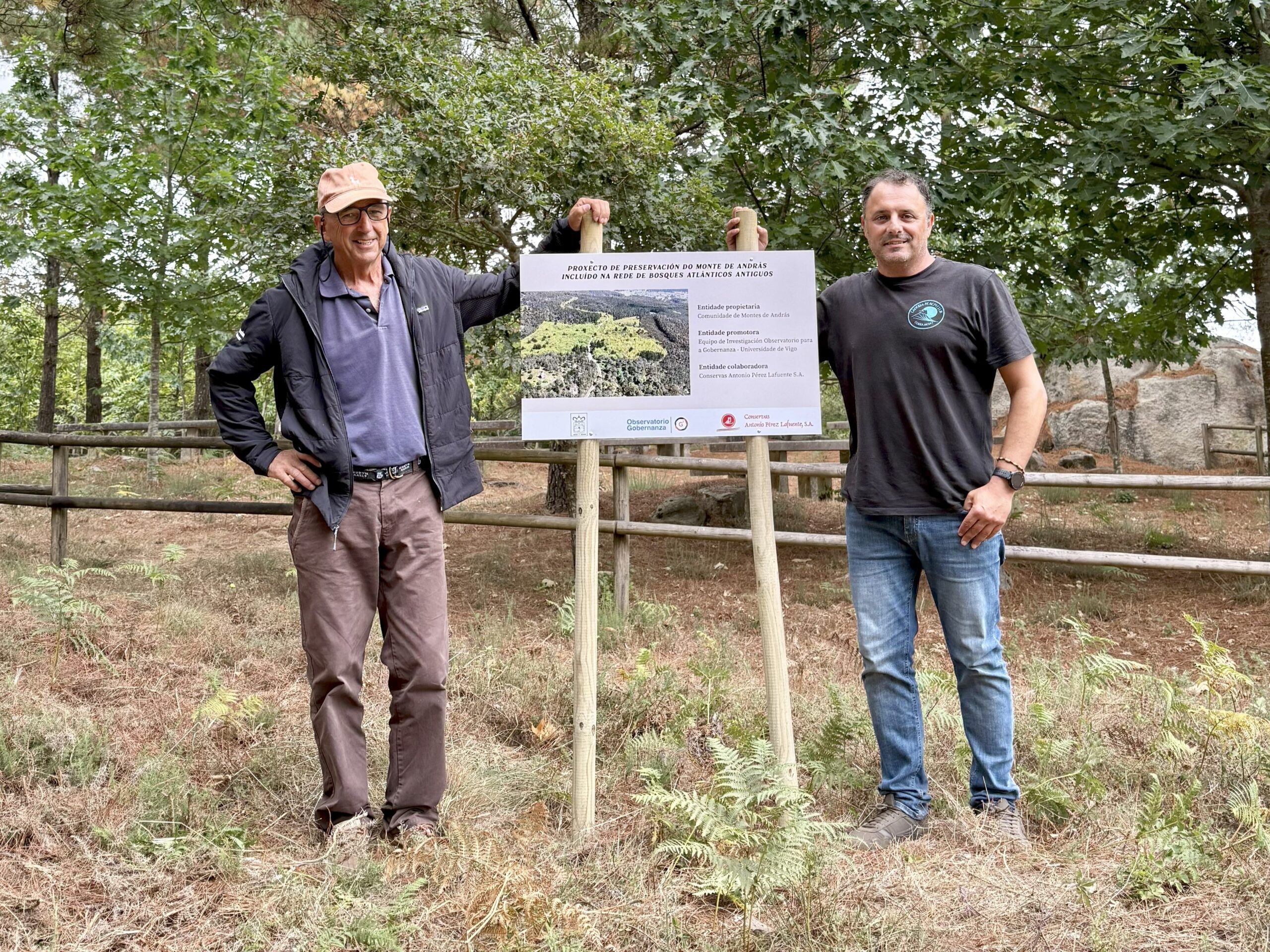 Instalouse o cartel que identifica a colaboración entre Conservas Antonio Pérez Lafuente, a Universidade de Vigo e a Comunidade de Montes de András para preservar e estudar un bosque de frondosas autóctonas de 16 hectáreas na parroquia de András, Vilanova de Arousa.